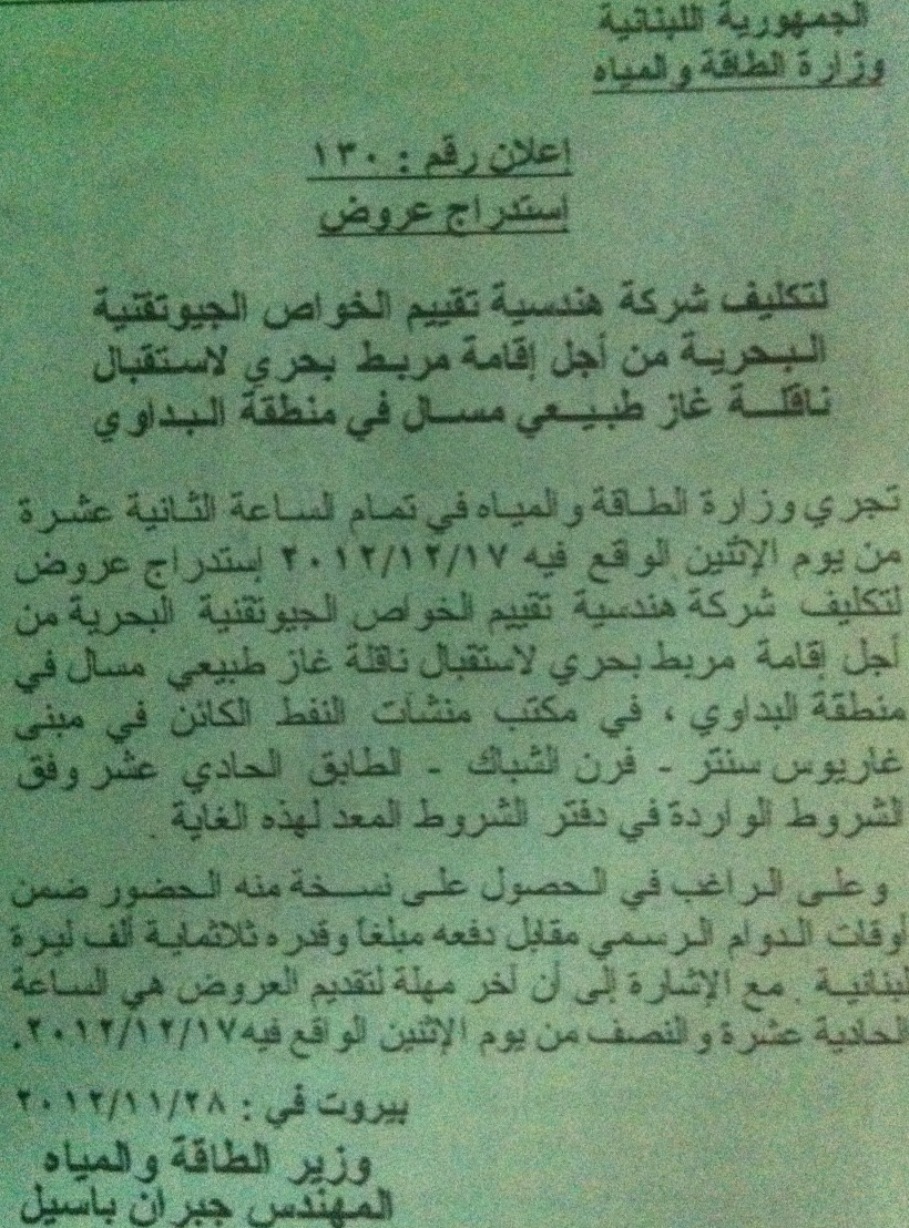 The Lebanese Ministry of Energy and Water issued a request for proposals on 28/11 to hire an engineering company that would be responsible of assessing the feasibility of establishing a terminal for an LNG carrier in Baddawi. Offers must be submitted by 17/12. Middle East Strategic Perspectives is reproducing the text of the request for proposals in Arabic (further details available at the office of the Ministry):
